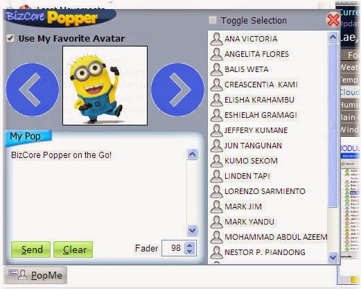 BizCore Popper is nothing but just a simple messenger right now. The purpose is for users of my ERP app to send messages to each other back and forth as long as said ERP app is running. Like other messengers, a user can send messages to any one of BizCore's online users, or to several users or to all users (Broadcast).